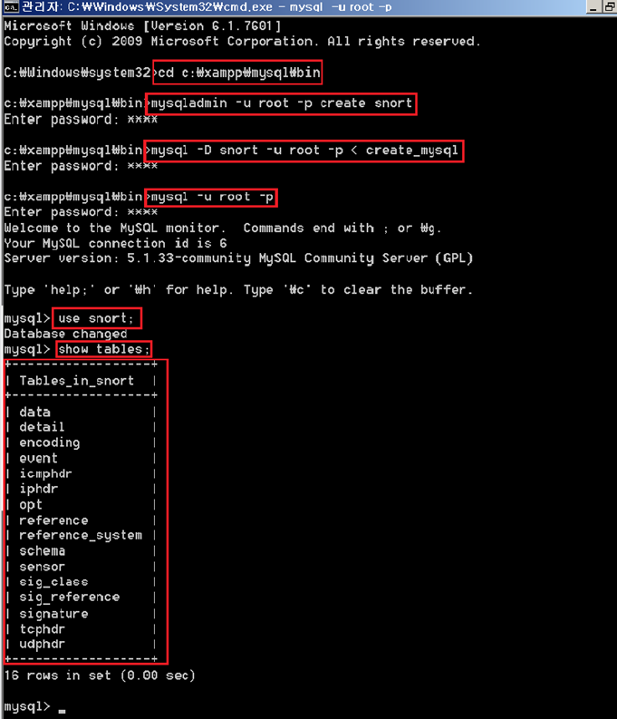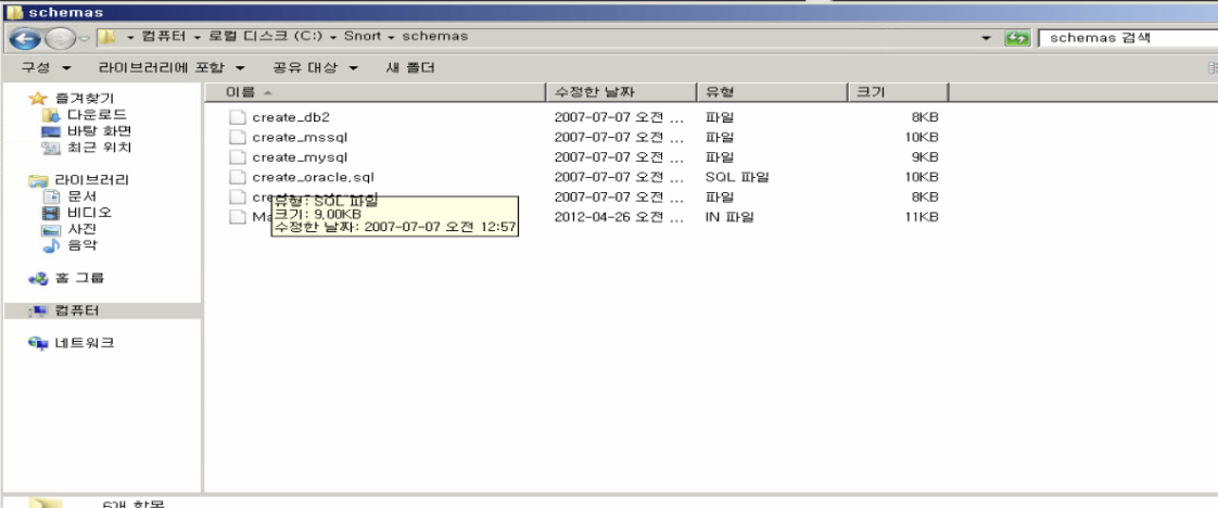 - 저렇게 붙여넣기를 해주어야 snort DB 생성후 해당 DB 안에 create_mysql 스키마가 적용됨