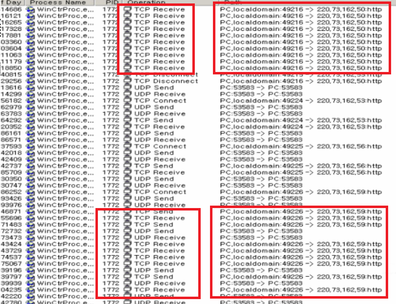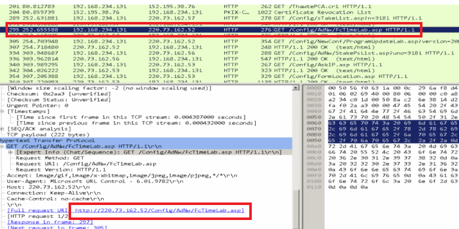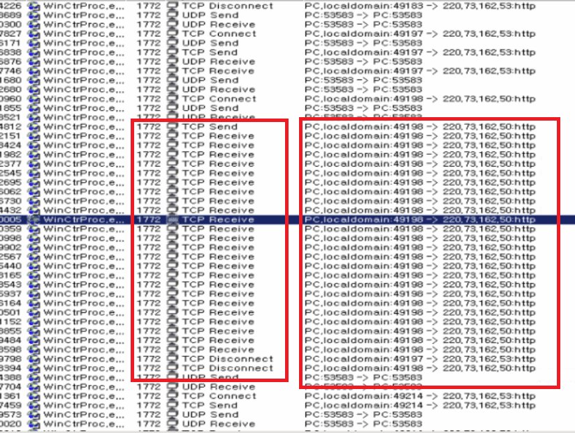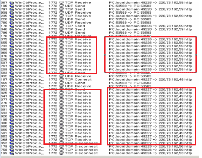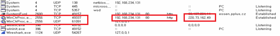 winCtrProc 프로세스가 220.73.162.49 라는 IP와 통신 연결이 확립됐다는 것을 볼 수 있다. 이때, 쓰이는 프로토콜은 http이다.