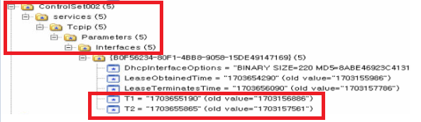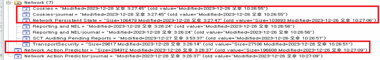네트워크 관련 변경값들을 악성코드를 실행 전과 후를 비교해볼 때, TCP IP 인터페이스에 들어갈 인자값, 쿠키값 변경 및 네트워크 지속 상태 변경, 각종 네트워크 활동 크기등이 변경 된 것을 확인해볼 수 있다. 이는 악성코드가 실행되고나서부터 해당 악성코드에 감염된 로컬호스트가 네트워크 활동을 활발히 했던 것에 의한 변화이다.