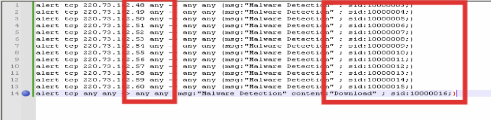 sid 10000003~10000015에서 보고 있는 IP들은 로컬 호스트가 220.73.162.52 서버에게 서버리스트를 요청했을 때 나온 IP들이다.(21page 참고) 그래서 각 탐지 패턴에서 출발지에 해당하는 IP가 52 서버에게 요청했던 서버리스트의 IP들이다.