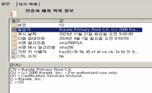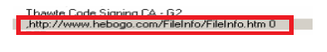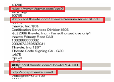 thawte는 인증서 발급 기관 회사명이다. 그리고 박스친 URL들은 악성코드 사이트 접속시 필요한 인증서 파일을 다운 받기위한 것들이다. Seoul1 Guro-gu1 한국 관련 지명을 언급한 것으로 보아, 한국 PC를 피해자에 포함시켜 악성코드를 제작했거나, 한국에서 해당 악성코드를 제작한 것으로 추정된다.