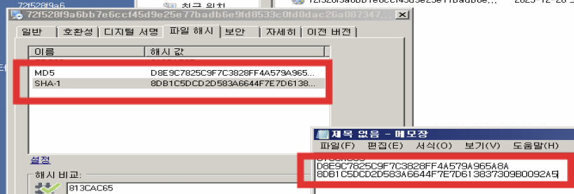 파일 해시값 도출 결과, 기초 분석에서 봤던 MD5 및 SHA-1 해시값이 위 사진에 나온 MD5 및 SHA-1 값이 같은 것을 확인하였다. 왼쪽 파일 속성안 해시값이 전체적으로 안나와서 오른쪽 메모장에 옮겨 넣었다. 이를 통해 해시값을 통해 무결성 검증을 통과시켰다.