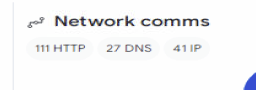 위 사진은 악성코드에 감염된 호스트가 주로 이용하는 DNS 서버 주소로 확인된다. 이 또한 네트워크 분석시 참고할만 요소이다. 오른쪽 사진은 네트워크 통신 관련 항목에 해당하는 개수 들이다. 즉, HTTP 통신을 한 대상 서버 대수가 111대이고, DNS 서버는 27대, 일반 IP 통신 대상은 41개로 보인다.