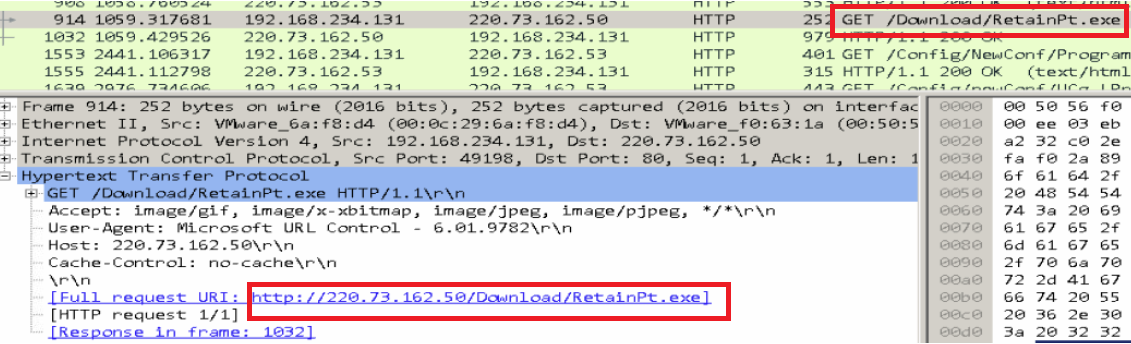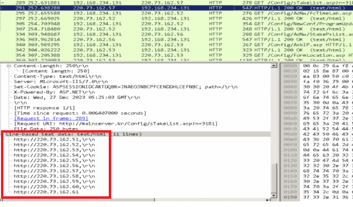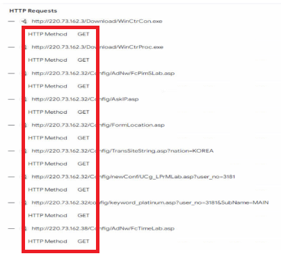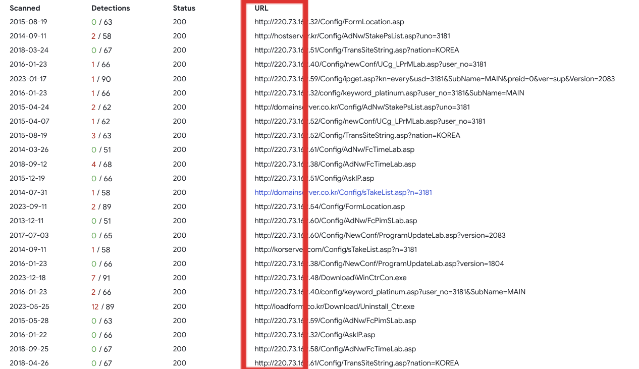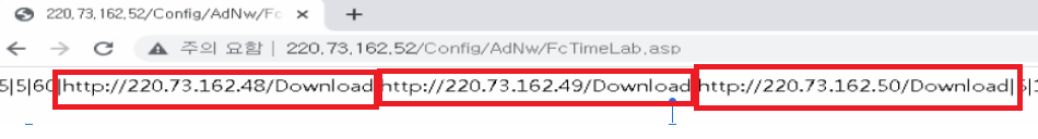 URL들이 나열되어있고, 각 URL들의 IP를 보면 앞서 분석에서 파악한 IP들로 보인다. 특히, 220.73.162.49 및 50 서버는 Process Monitor에서 상당히 많은 TCP 수신 로그를 기록했던 서버들이다. 경로 마지막에 Download라는 것으로 보아 해당 서버로 들어가 파일을 다운로드 해야했기에 저렇게 많은 수신로그를 기록했을 것으로 보인다.