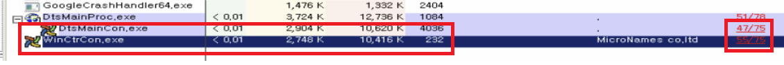 계속 이어서 DtsMainCon 이라는 프로세스가 DtsMainProc라는 프로세스 하단에 자식 프로세스로 생성된 것으로 보아 DtsMainProc 프로그램이 앞에서 보았던 220.73.162.52 서버에 TCP 연결을 하여 DtsMainCon 프로그램을 로컬 호스트에 다운로드한 다음, 실행시킨 것으로 보인다. 해당 프로세스는 75개의 백신 엔진 중 47개가 악성코드로 진단하였다. 나아가 winCtrCon 프로세스도 새로 생겨났으며, 75개의 백신 엔진 중 55개의 백신 엔진이 악성코드라 진단하였다. 이 모두, 악성코드 실행과 동시에 자동적으로 백그라운드 상에서 앞선 프로그램들이 로컬 호스트의 의지와 상관없이 암묵적으로 설치가 진행되었다.