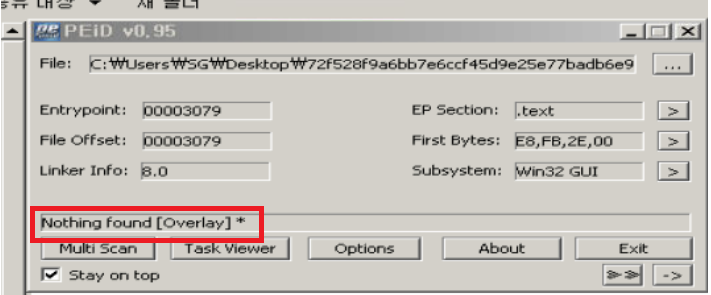 교차 검증을 위해 PEID 에서 교차 검증한 결과, 이 또한 패킹되어 있지 않았다.