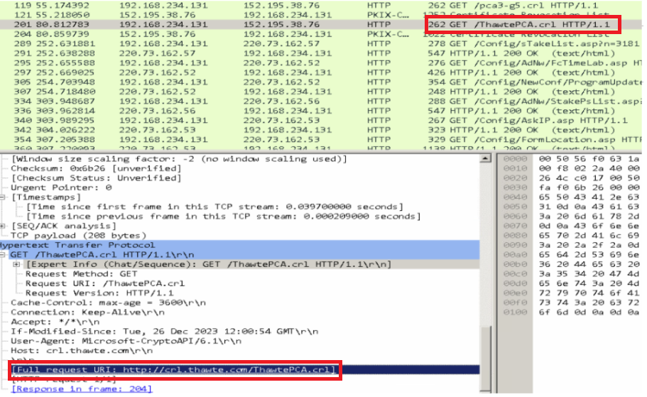 http 통신을 기준으로 패킷 흐름을 살펴본다. 해당 프로토콜을 기준으로 살펴보는 이유는 앞서 악성코드에 감염된 로컬호스트가 주로 통신하는데 쓰이는 프로토콜이 http이었기때문이다. 이때, 악성코드 통신과 관계가 있을 것으로 보이는 초기 통신을 살펴 보면, thawte가 보인다.이는 앞서 보았던 인증서 발급 회사라고 언급했었다.(10page 참고) 해당 IP는 152.195.38.76이다. 그러면 해당 IP와 관련된 통신들은 모두 유해사이트 관련 인증서 발급과 관련된 통신이라고 예상된다.