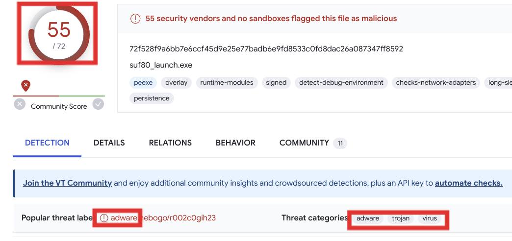 해당 악성코드 프로그램 분석의 방향성을 잡기위한 목적으로 바이러스 토탈에 조회해보았다. 72개의 백신 엔진 중 총 55개의 백신 엔진에서 악성코드라 진단하였다. 나아가 진단 키워드는 Adware, Trojan, virus라고 진단하였다. Adware로 대부분 진단되는 상황이다.