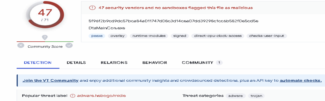 확인 결과, adware 및 tojan이라는 악성코드 특성이 확인됐다.