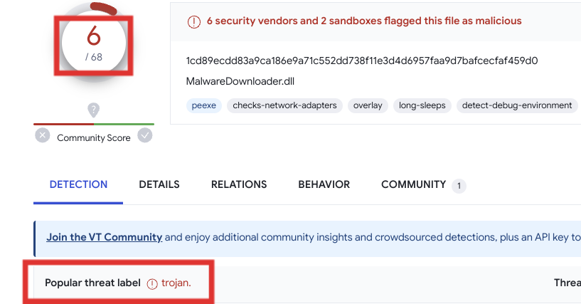 MalwareDownloader.dll의 virustoal 조회 결과, 68개의 백신 엔진 중 6개가 trojan 특성을 가진다고 진단했다.