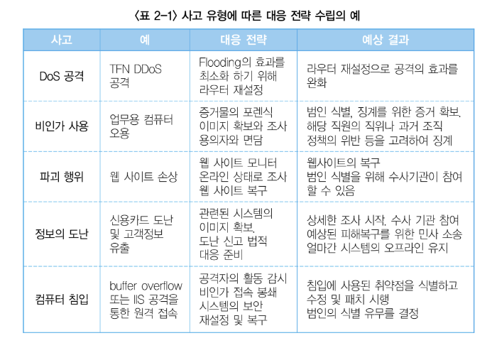 - 복구 및 해결 과정 : 차기 유사 공격을 식별 및 예방하기 위한 보안 정책의 수립, 절차 변경, 사건의기록, 장기 보안 정책 수립, 기술 수정 계획수립 등을 결정