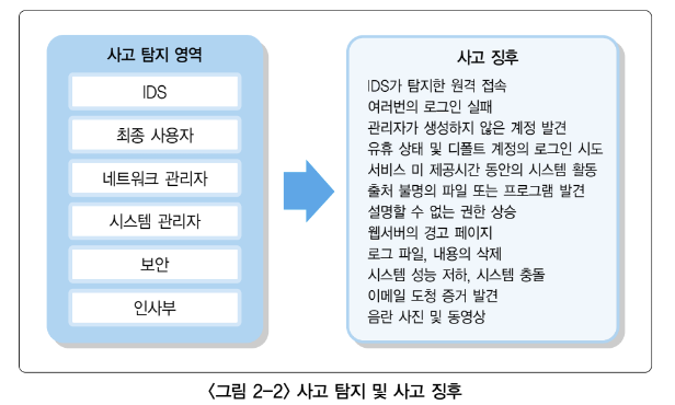 - 사고 탐지 : 정보보호 및 네트워크 장비에 의한 이상 징후 탐지. 관리자에 의한 침해 사고의 식별