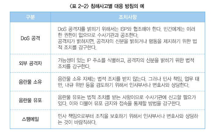 - 대응 전략 체계화 : 최적의 전략을 결정하고 관리자 승인을 획득, 초기 조사 결과를 참고하여 소송이 필요한 사항인지를 결정하여 사고 조사 과정에 수사기관 공조 여부를판단