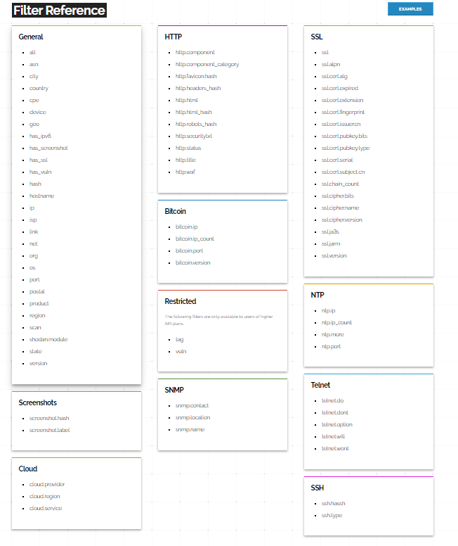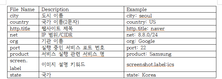 - 다양한 필터를 통해 인터넷에 연결된 다양한 유형의 장비(웹캠, 라우터 , 스위치, IOT 장비 등)를 검색할 수 있는 검색 엔진