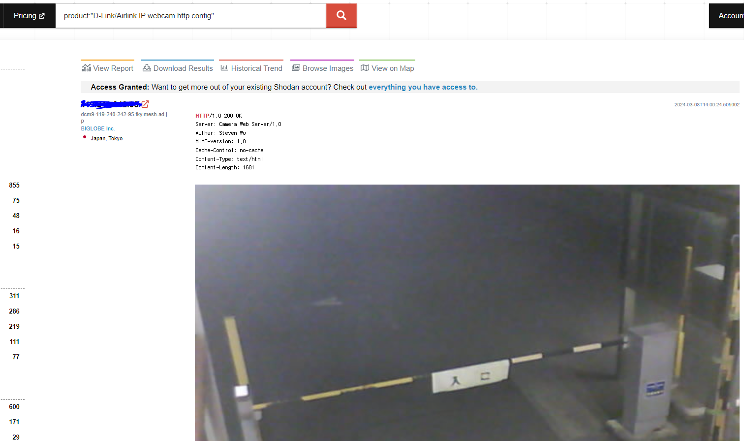 - 필터 예시: product:"D-Link/Airlink IP webcam http config"