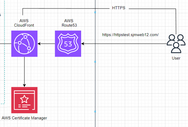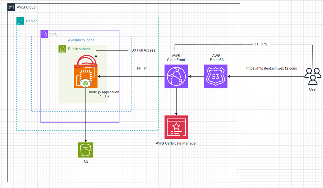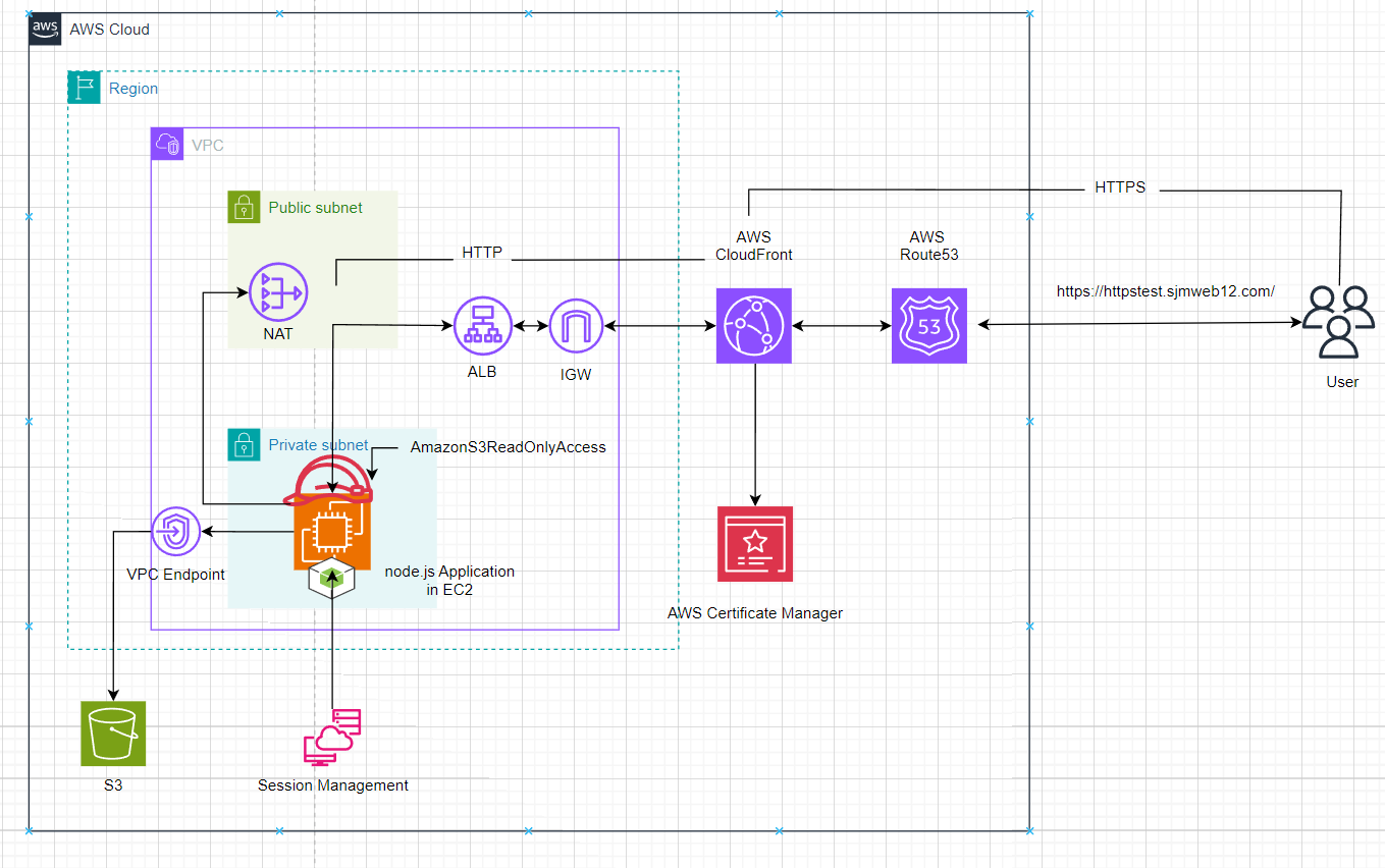- S3를 내용물을 조회하는 Node.js 어플리케이션 EC2 웹서버를 https://httpstest.sjmweb12.com/ 이라는 URL을 통해 사용자가 접속할 수 있도록 구성한 아케텍쳐이다.