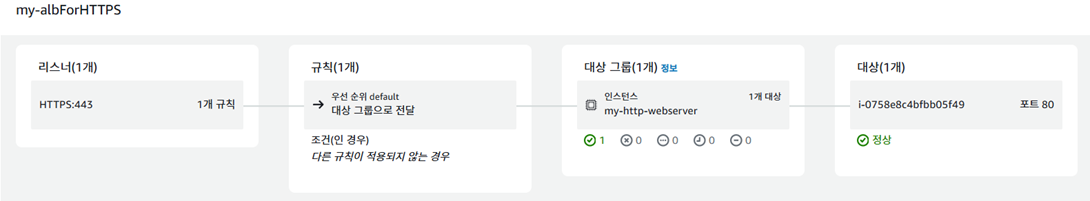 - ALB(Application Load Balancer): 사용자가 위 URL에 접속을 시도하면 타겟 그룹안에 있는 EC2 웹 서버쪽으로 트래픽 전달하는데, 이때 사용자와는 https 통신을, 웹 서버와는 http 통신을 제공한다. 서버가 다운되어있는지 health check 기능도 수행한다.