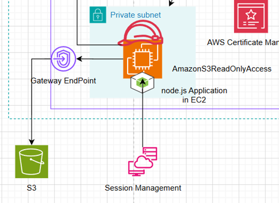 - S3를 내용물을 조회하는 Node.js 어플리케이션 EC2 웹서버를 https://httpstest.sjmweb12.com/ 이라는 URL을 통해 사용자가 접속할 수 있도록 구성한 아케텍쳐입니다.