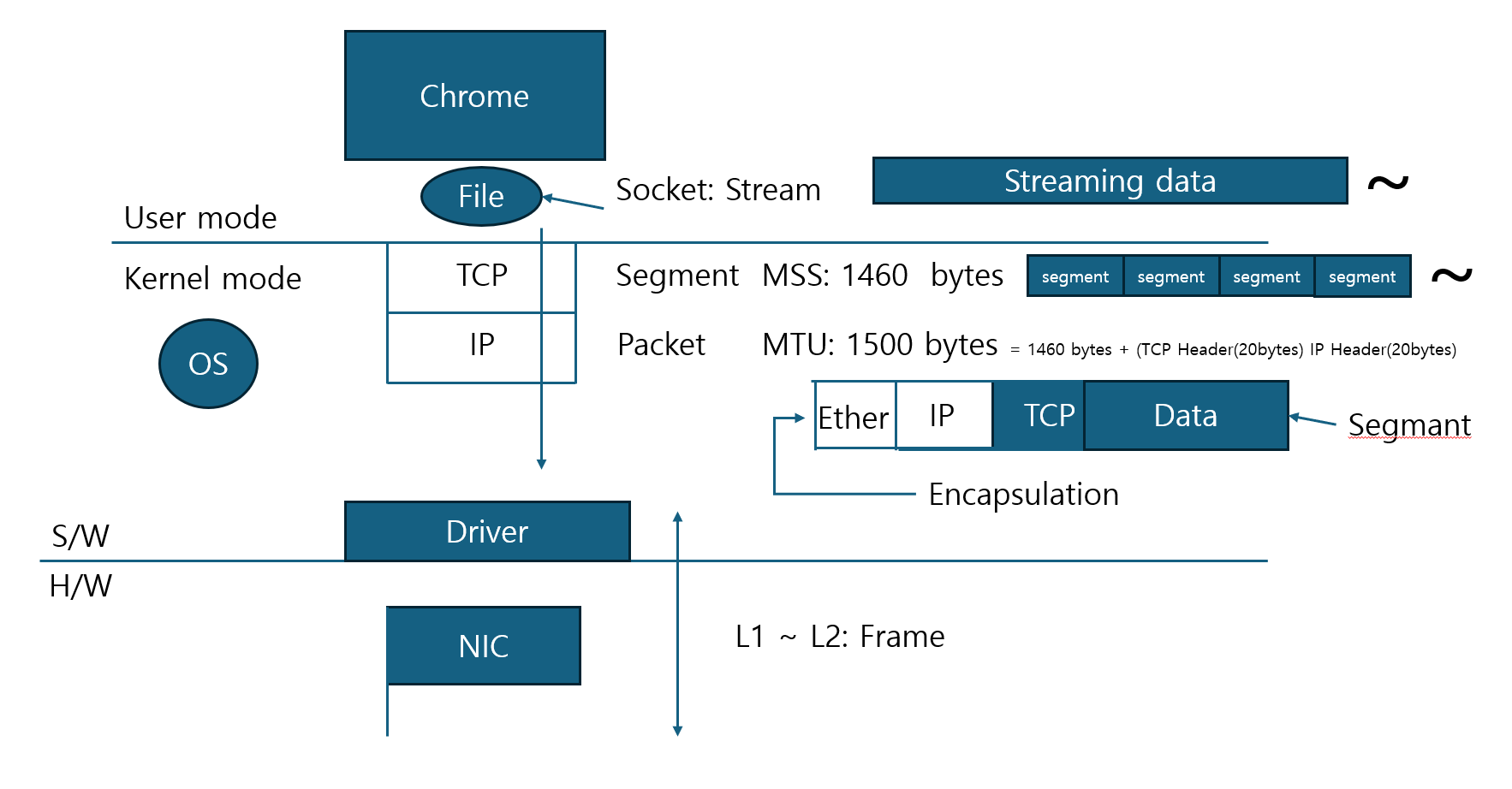 어플리케이션단에서 네트워크 접근 계층까지 데이터의 흐름을 살펴보면, 프로세스상에서 정해준 연속적인 데이터가 Socket 타고 아래 계층으로 내려가는데 이를 Stream 이라고 한다. Stream은 시작은 정해져 있지만, 그 끝은 알 수 없다. 그 끝은 프로세스가 정해준다. 그리고 그 밑에 TCP 단에는 Segment 라는 단위의 데이터들이 있고, IP 단에는 Packet 이라는 단위의 데이터들이 있다. 그리고 이들의 Maximum 사이즈는 각각 1460bytes, 1500bytes 정도 한다.