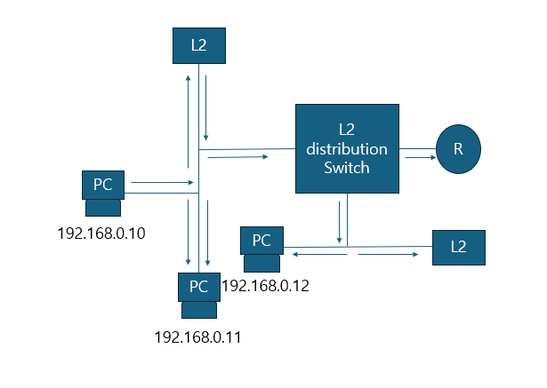 그럼 이 gateway가 목적지 주소가 3.3.3.3이라고 확인하고 인터넷으로 보내준다. 그러면 여기서 유통과정을 거쳐서 네이버까지 전달이 될 것이다. 그런데 만약에 목적지 주소가 192.168.0.255라고 하면 이건 broadcast 주소이고 이 패킷이 L2 Access Switch를 거쳐서 L2 Distribution Swtich를 가는 순간 192.168.0대역을 쓰는 host들에게 전부 퍼진다. 즉, 1번PC가 패킷을 보내면 2,3, switch 장비들과 라우터의 게이트웨이 인터페이스한테 전부 패킷이 전달된다는 것이다.