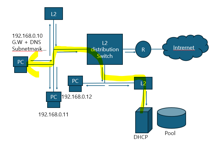 즉, DHCP 서버는 이러한 정보들을 pool이라는데 관리하는데 이 pool에서 인터넷 정보를 꺼내줘서 할당을 할 때 중복을 방지하기 위해 각종 메커니즘으로 통제를 한다. 그리고 이러한 정보를 받기위해선 DHCP와 해당 PC간 같은 브로드캐스트 도메인안에 묶여야 한다.