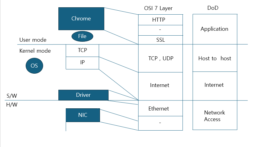 이런식으로 OSI Layer를 분류했을 때 L1~L2는 NIC + Driver, L3는 IP, L4는 TCP, L5~L7은 Chrome App 같은것을 커버한다.